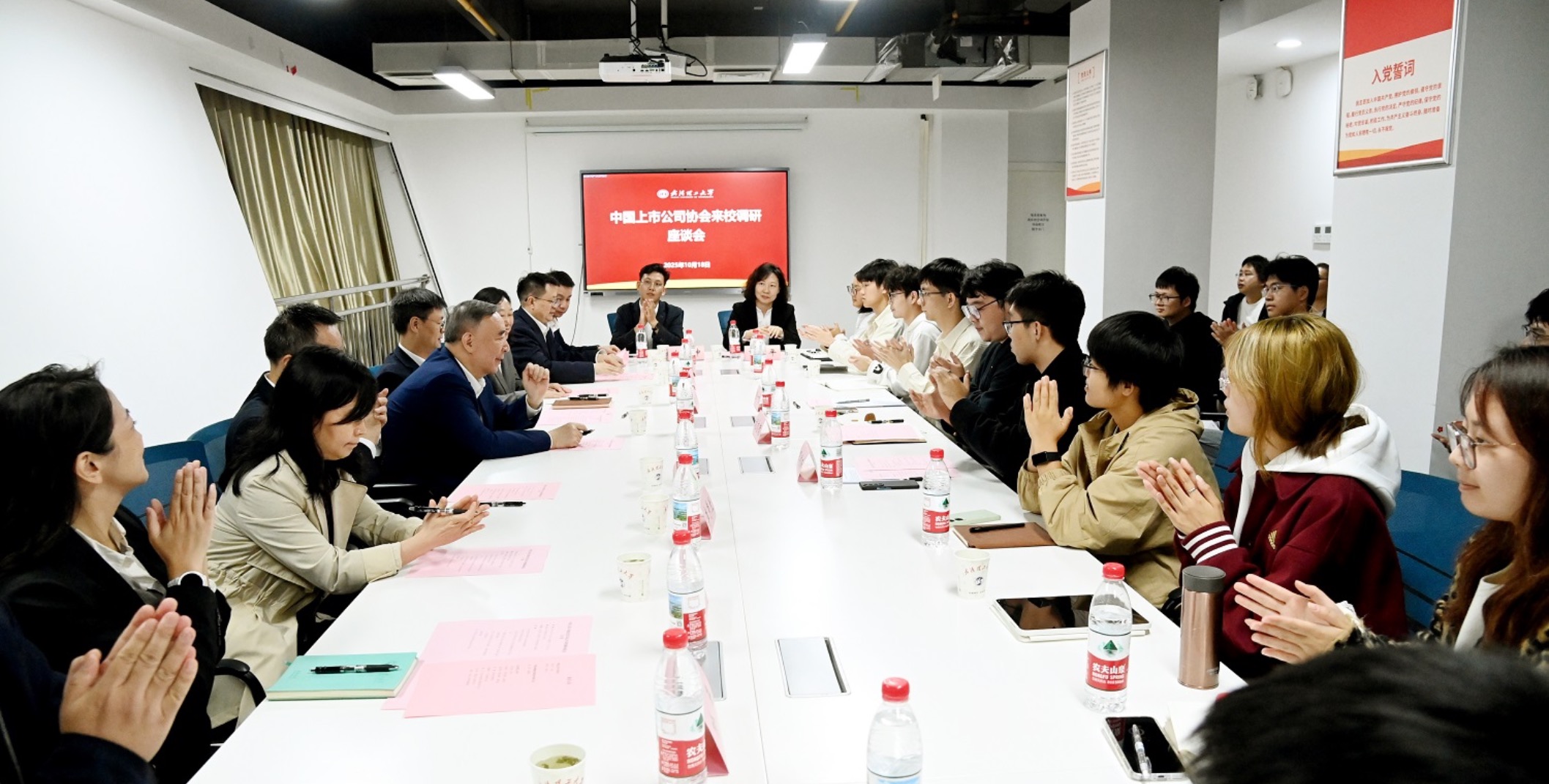 新闻网讯 10月18日下午,中国上市公司协会会长宋志平一行来校调研大学生创新创业工作。校长王发洲,副校长刘春江、麦立强,中复神鹰碳纤维股份有限公司董事长张健出席座谈会。王发洲对宋志平一行来访表示热烈欢迎,介绍了学校在学科建设、人才培养,特别是在构建特色鲜明的创新创业教育体系方面取得的成果。他表示,学校始终致力于为国家和社会培养拔尖创新人才,期待通过此次交流,进一步推动学校创新创业教育与实践的深度融合,共同探索人才培养与产业需求更紧密对接的新机制、新路径,助力学子更好地服务国家创新驱动发展战略。宋志平会长高