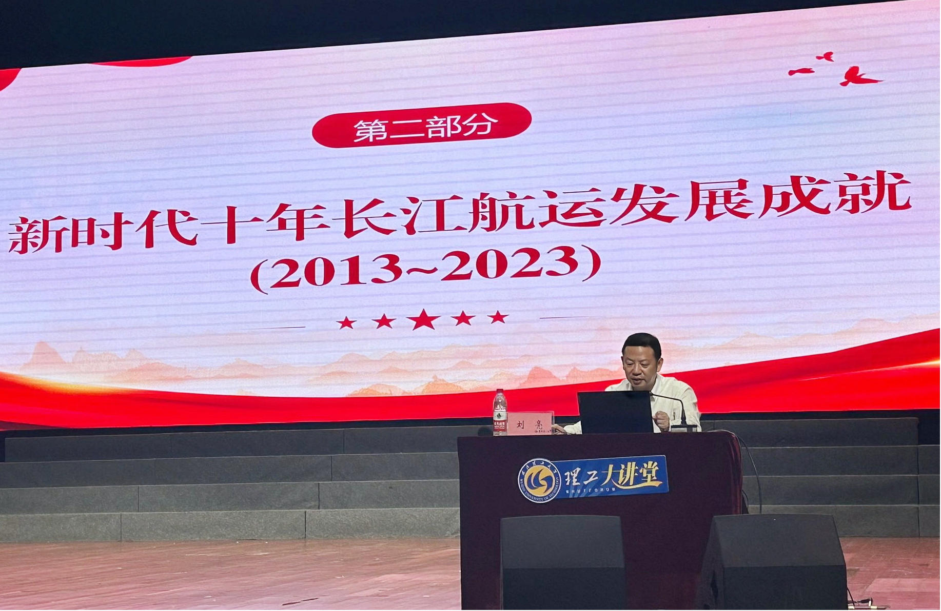 刘亮向师生介绍了新时代长江航运改革、建设、发展取得的成就,从世界内河航运发展、综合交通发展趋势、长江航运自身发展三个维度分析了长江航运发展现状及水平,着重介绍了以“131”智慧长江建设推进长江航运高质量发展,加快实现长江航运现代化的主要思路、实施路径、重点任务及阶段性成果。