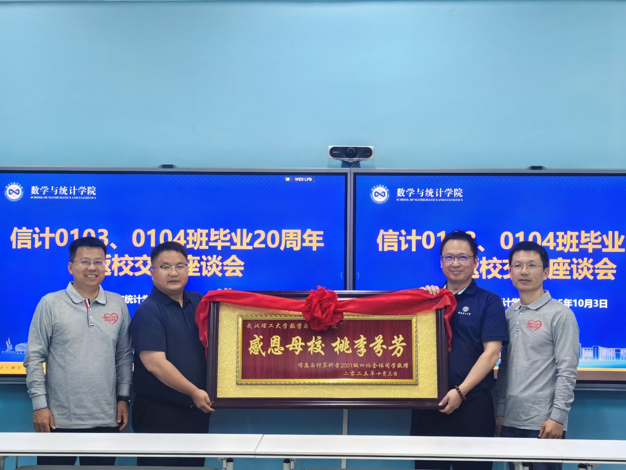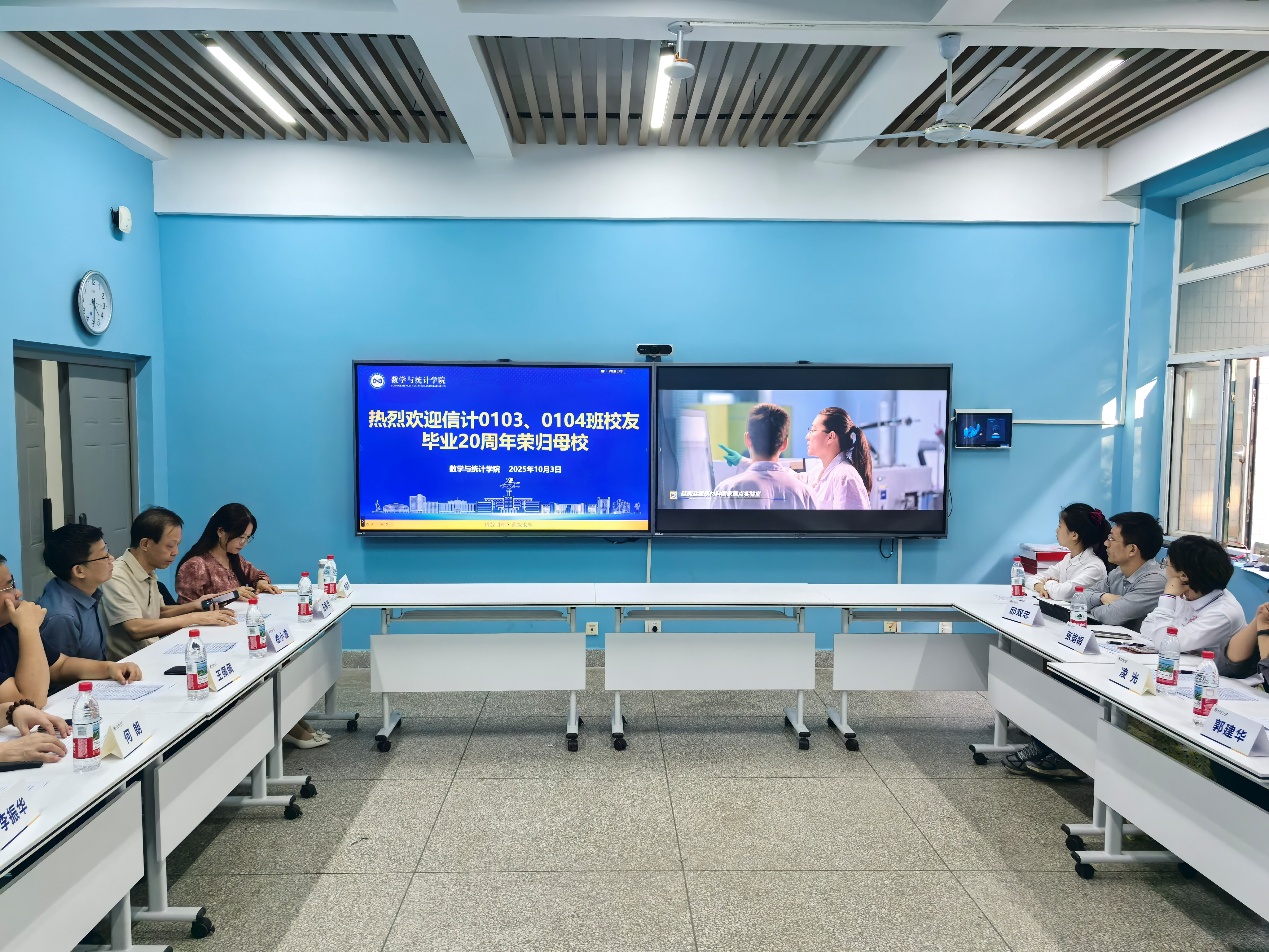 10月3日下午,数学与统计学院于学院215会议室举行信息与计算科学专业01级毕业20周年返校交流座谈会。学院院长何朗、党委书记王佩佩、副书记李振华,信计01级辅导员、后勤管理处副处长徐小波,信计0104班英语老师王爱军,数学系班子成员及教师代表参加了座谈会。会议由学院党委副书记李振华主持。