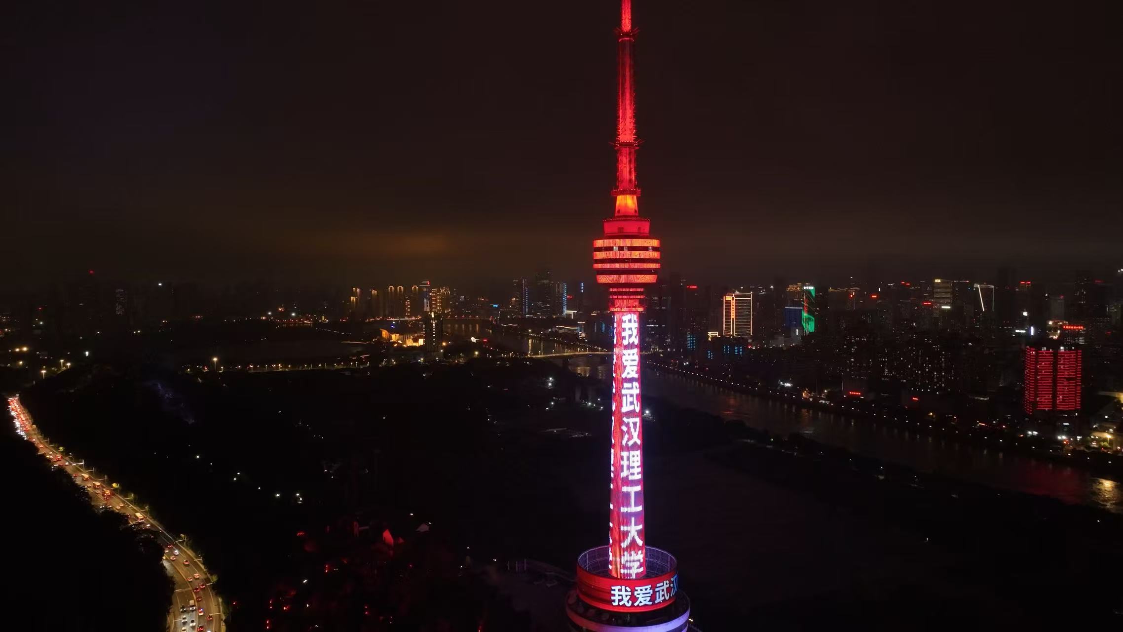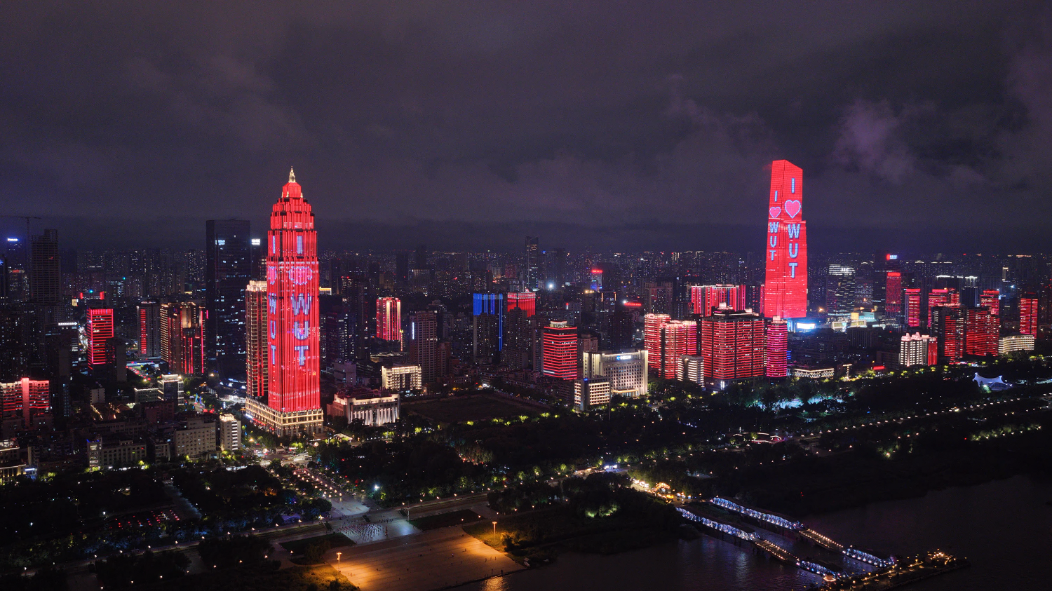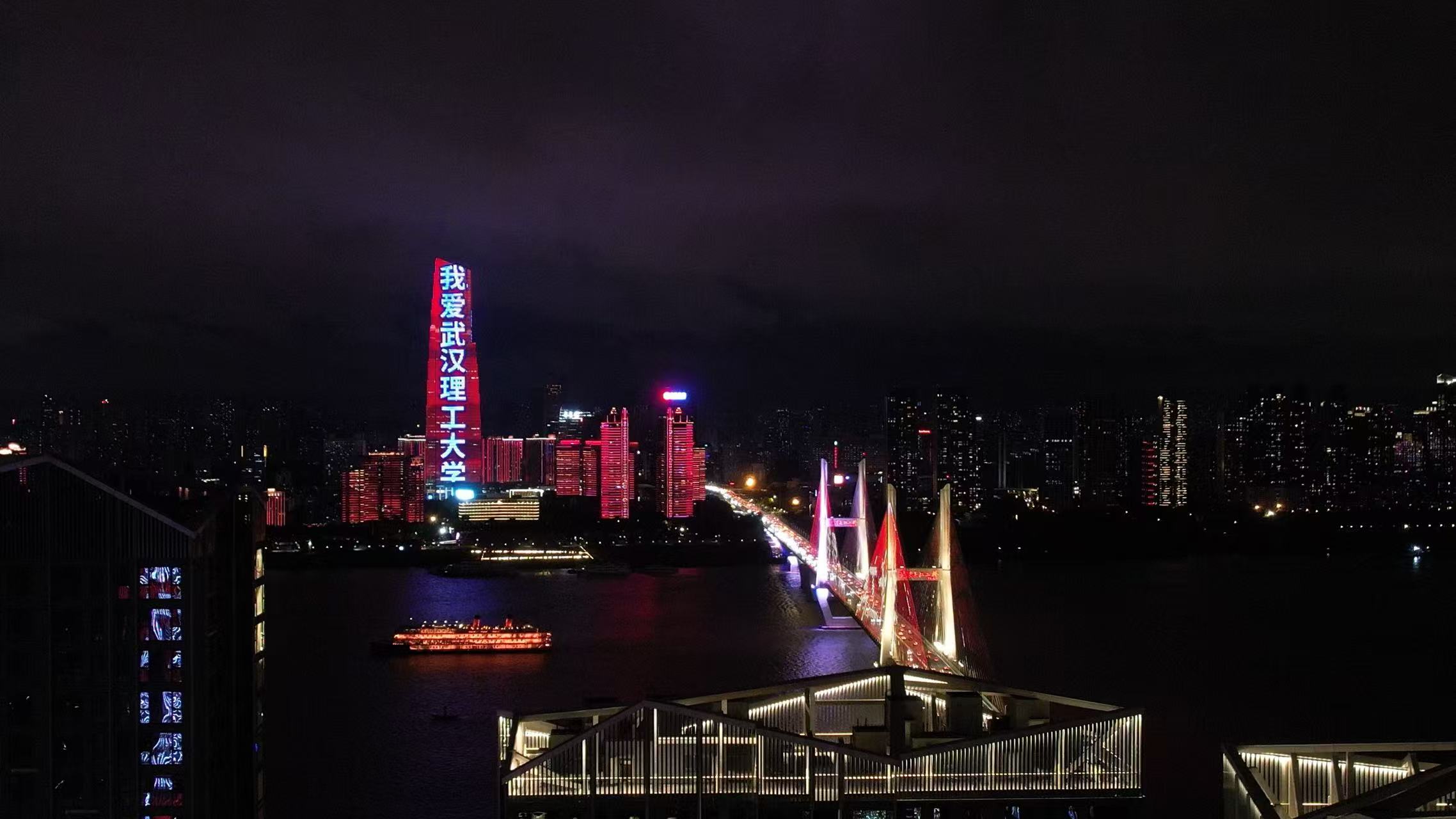 长江大桥、黄鹤楼、绿地金融中心、长江二桥……长江两岸幢幢标志性建筑光影璀璨。楼宇林立,桥梁飞架,在灯光的映射中流光溢彩,美轮美奂。“以武汉理工之名 赴中国车谷之约”“I ❤ WUT”等字样跃动其间,武汉理工为江城梦幻夜景更添一抹亮色。