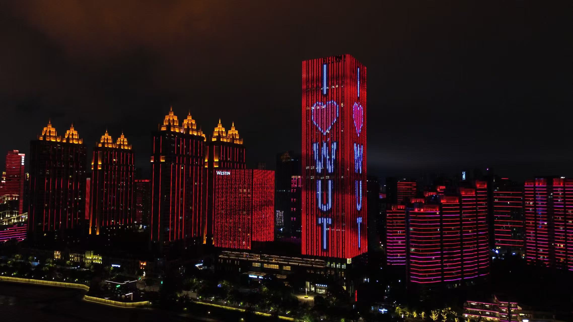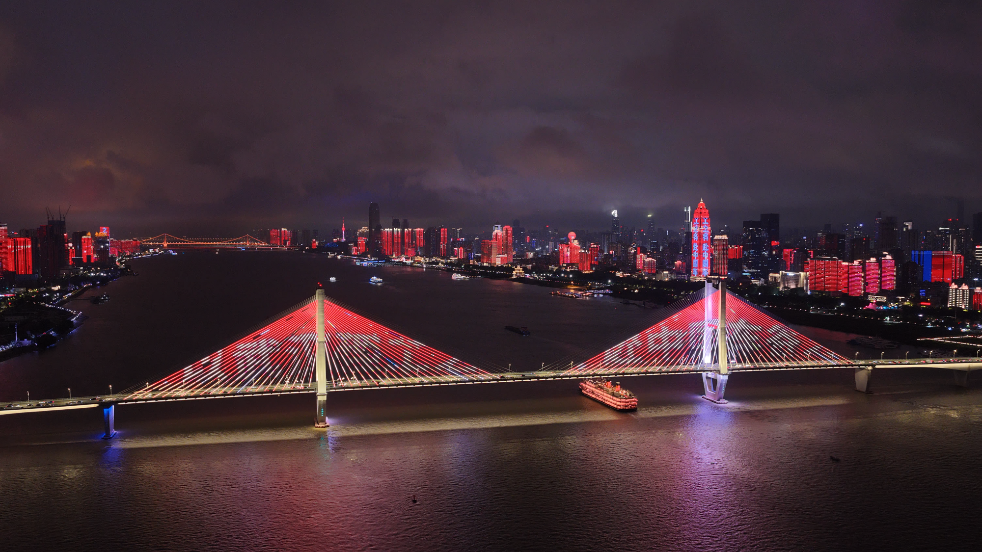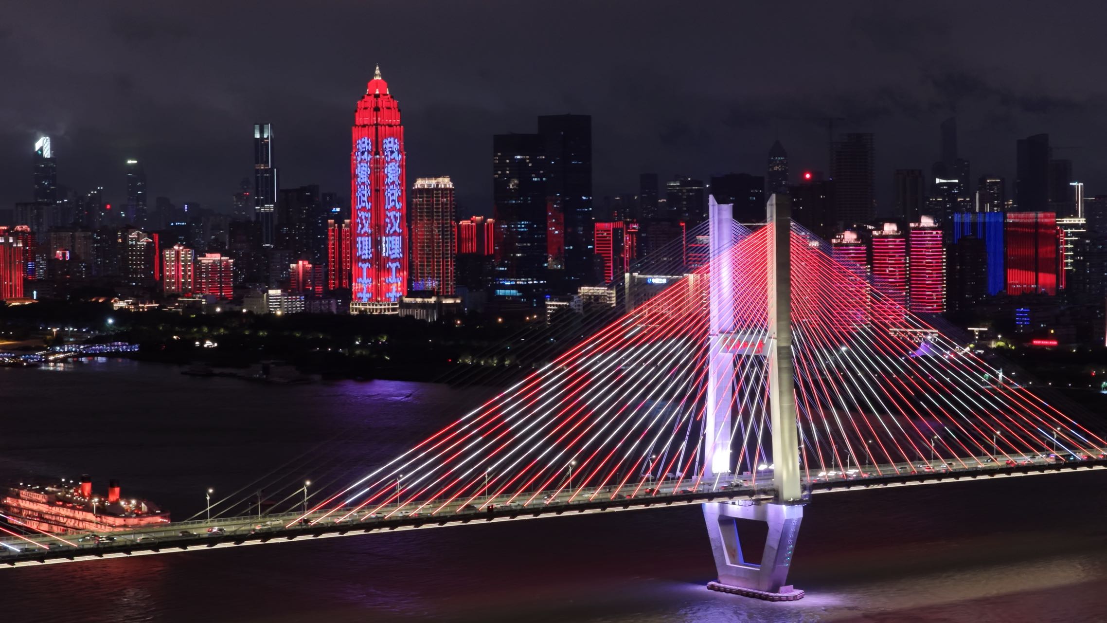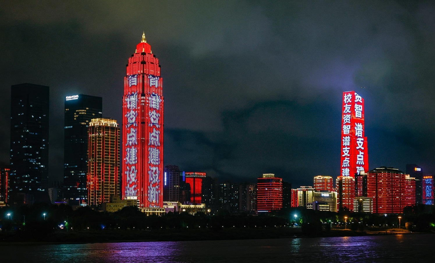 长江大桥、黄鹤楼、绿地金融中心、长江二桥……长江两岸幢幢标志性建筑光影璀璨。楼宇林立,桥梁飞架,在灯光的映射中流光溢彩,美轮美奂。“以武汉理工之名 赴中国车谷之约”“I ❤ WUT”等字样跃动其间,武汉理工为江城梦幻夜景更添一抹亮色。