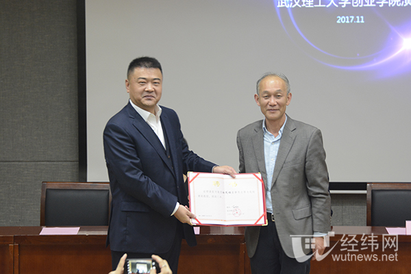 兼职教授聘任仪式在201报告厅举行,康灿华副校长为徐茂栋董事长颁发兼职教授聘书。