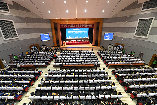 6月16日的西院大礼堂和6月17日的余区大学生活动中心,气氛隆重而热烈,武汉理工大学2019届毕业生毕业典礼分7场先后在两处举行。校领导信思金、张清杰、王乾坤、夏江敬、康灿华、刘祖源、陈文、赵经、